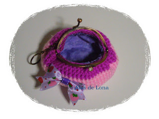 El que está en el centro, es de la misma forma, pero con cremallera en vez de boquilla. Lleva flor fuxico con hojas de ganchillo. La cinta con anilla llavero se puede guardar dentro si se quiere.